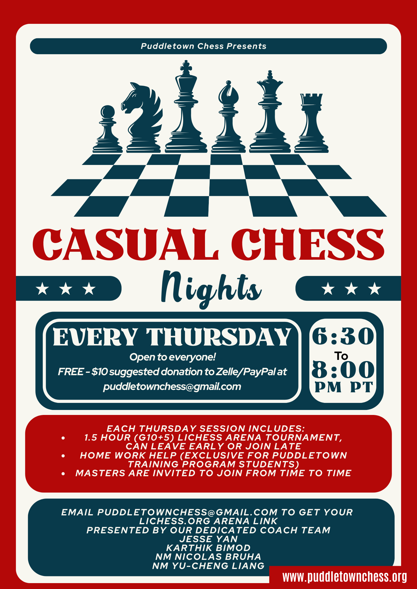 - Entry is free and open to all. A suggested donation of $10 would be greatly appreciated. Zelle/PayPal at puddletownchess@gmail.com